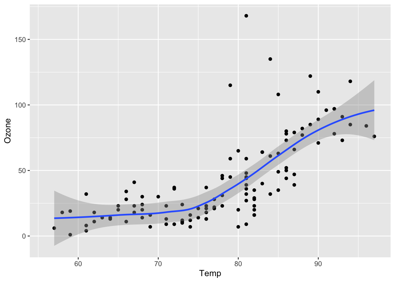 #| "A scatterplot with temperature by ozone levels along with a trend line