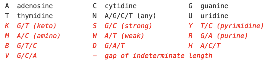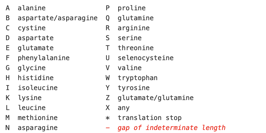 Il Formato FASTA è un formato di testo per rappresentare le sequenze nucleotidiche o le sequenze aminoacidiche. Sia i nucleotidi che gli aminoacidi sono rappresentati da una singola lettera. Sulla prima linea antecedente alla sequenza nucleotidica/aminoacidica viene riportato il nome della sequenza, preceduto dal simbolo “>”