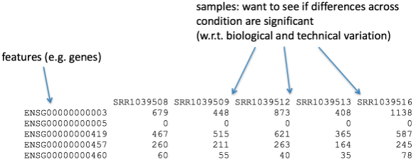 | CPM (counts per million) | counts scaled by total number of reads | sequencing depth | gene count comparisons between replicates of the same samplegroup; NOT for within sample comparisons or DE analysis |